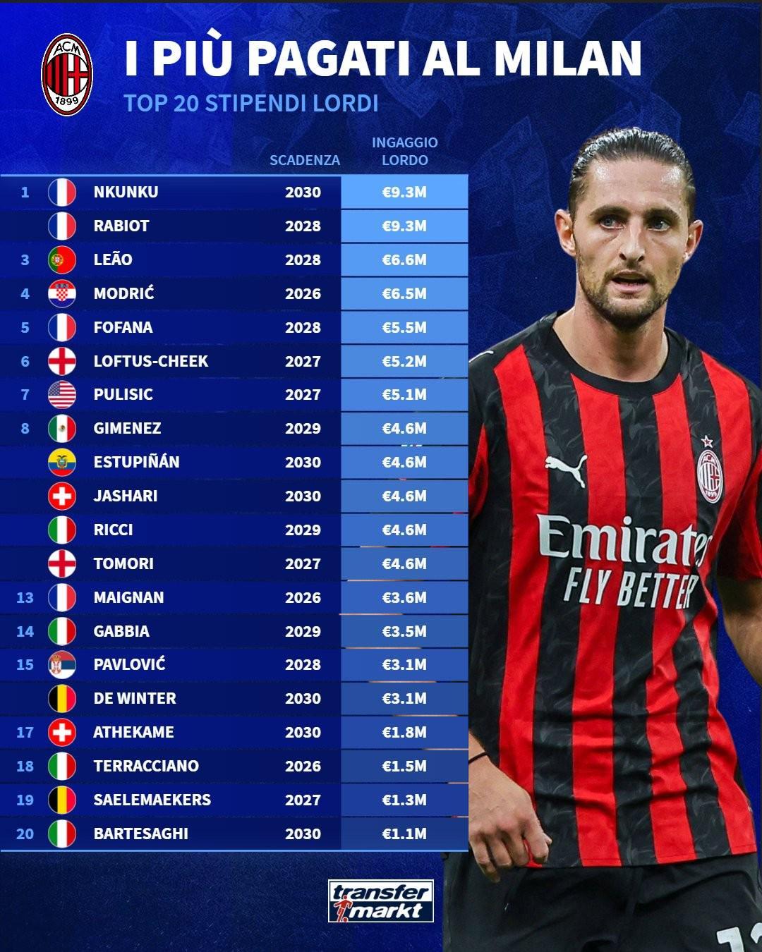 米兰本赛季税前年薪TOP20:恩昆库、拉比奥第1,普利希奇第7
