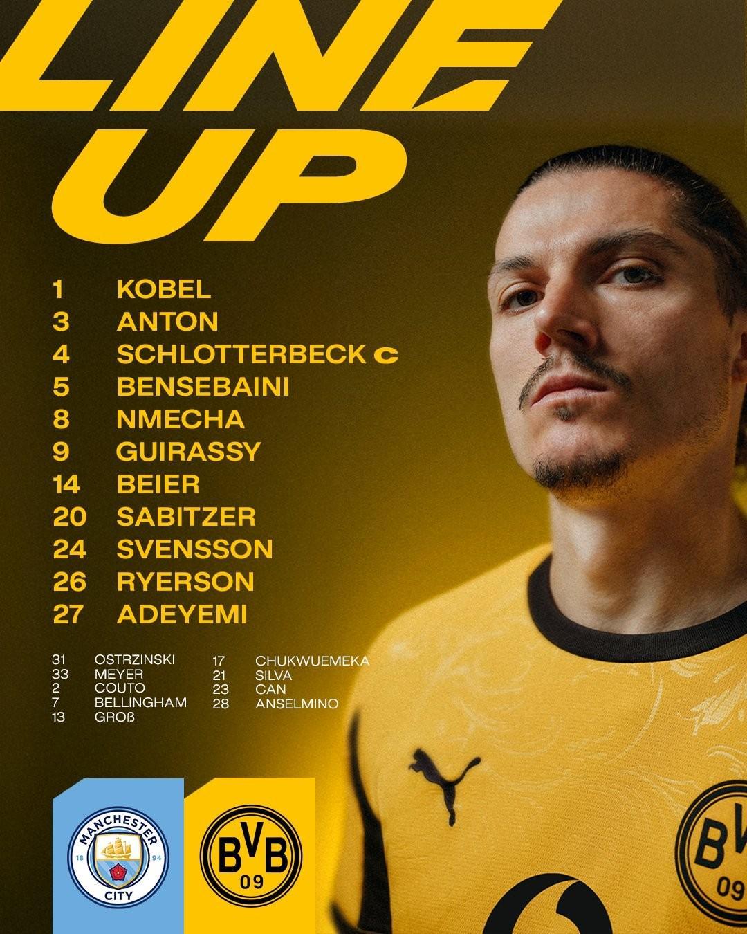 多特首发:1-科贝尔、3-安东、4-施洛特贝克、5-本塞拜尼、26-瑞尔森、8-恩梅加、20-萨比策、24-斯文松、27-阿德耶米、14-拜尔、9-吉拉西