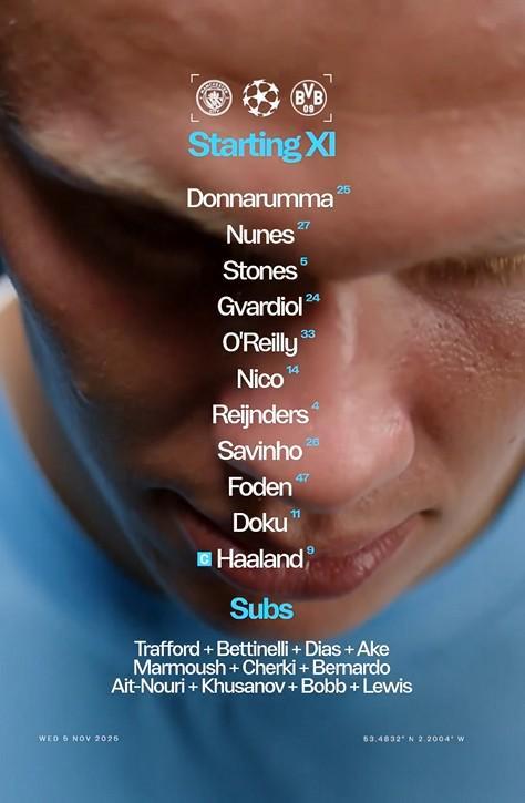 北京时间11月6日凌晨4点,欧冠联赛阶段第4轮展开一场焦点战役,曼城对阵多特。赛前,双方公布首发阵容。