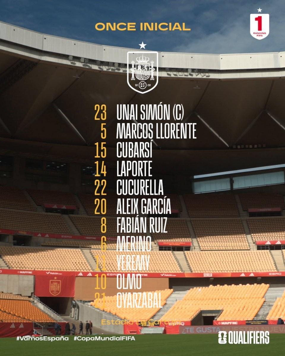 西班牙首发:23-乌奈-西蒙、5-马科斯-略伦特、15-库巴西、14-拉波尔特、22-库库雷利亚、6-梅里诺、20-阿莱士-加西亚、8-法比安-鲁伊斯、11-耶雷米-皮诺、21-奥亚萨瓦尔、10-奥尔莫